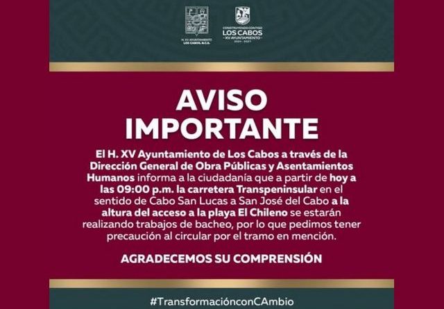 Los Cabos, Baja California Sur a 18 de Noviembre del 2025.- Por instrucciones del presidente municipal Christian Agúndez Gómez, se informa a la ciudadanía que este lunes 17 de noviembre a partir de las 21:00 horas se pondrán en marcha labores de bacheo y reencarpetado en uno de los tramos con mayor afectación vial en la zona de Chileno, como parte del programa permanente “Caza Baches”, cuyo objetivo es garantizar vialidades seguras y en óptimas condiciones para todas y todos.