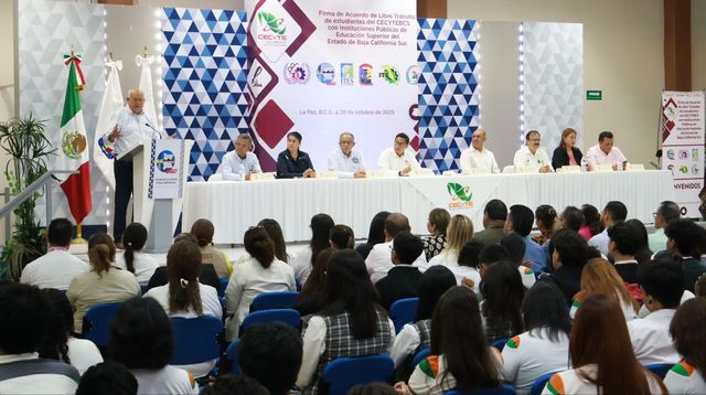 El gobernador Víctor Manuel Castro Cosío encabezó la firma del Acuerdo de Libre Tránsito de Educación Media Superior a Nivel Superior entre el Colegio de Estudios Científicos y Tecnológicos de Baja California Sur (CECyTEBCS) y diversas universidades y tecnológicos de la entidad, que permitirá a las y los estudiantes continuar sus estudios en el nivel superior sin necesidad de presentar examen de admisión, cumpliendo con el promedio mínimo requerido por las instituciones.