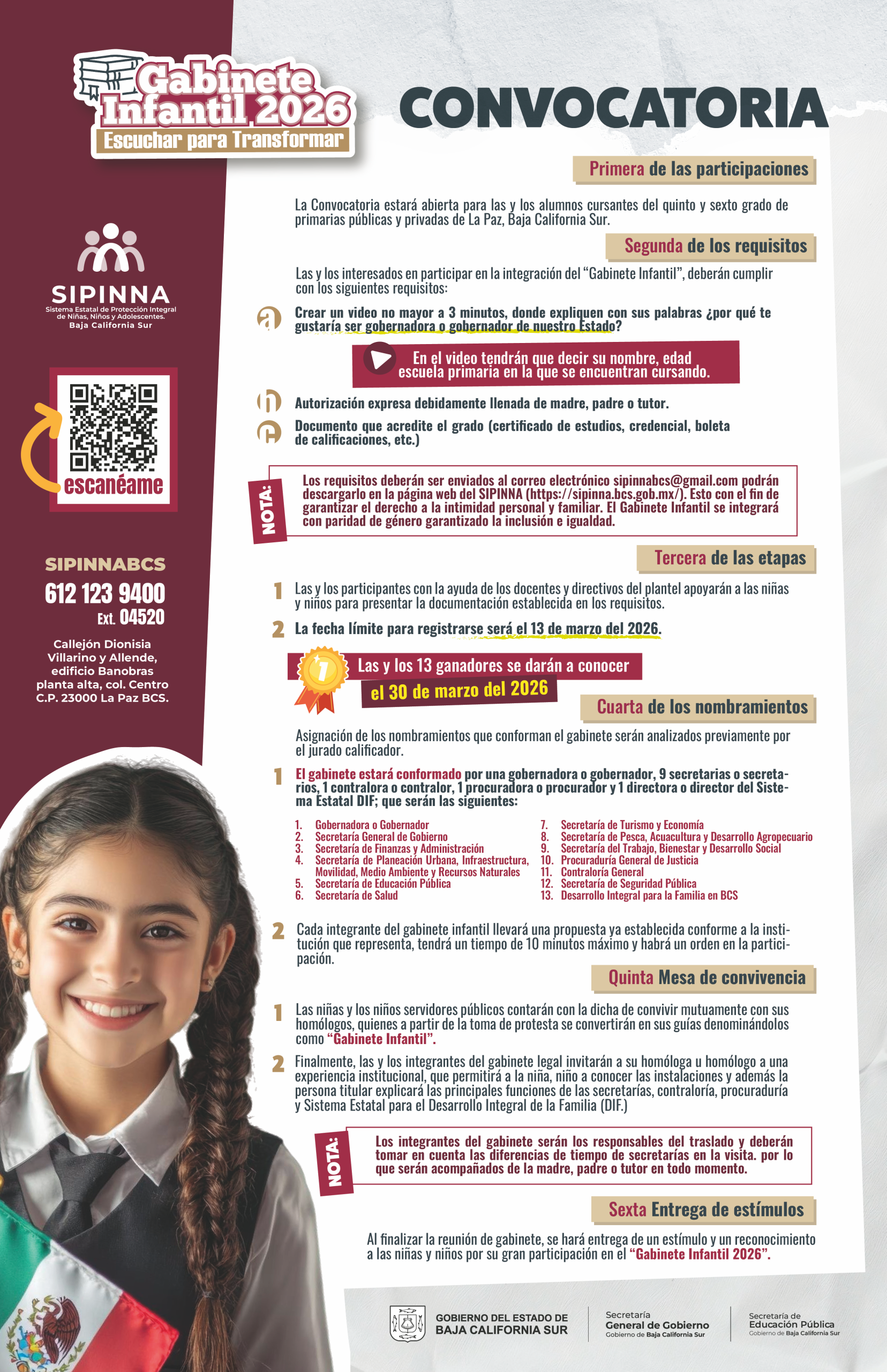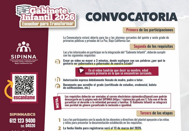 Villa Urías mencionó que la convocatoria puede consultarse en las páginas web sipinna.bcs.gob.mx, sgg.bcs.gob.mx, en las redes sociales del Gobierno del Estado o comunicándose al 612 123 94 00, extensión 04520.