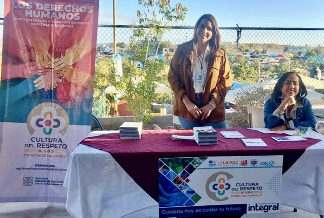 Con el objetivo de fortalecer comunidades más informadas, seguras y libres de violencia, el Departamento de Derechos Humanos de la Secretaría General de Gobierno participó en la cuarta Feria de la Salud, organizada por la asociación civil CERCA A.C. y la Universidad Internacional de La Paz (UNIPAZ), en la colonia Vista Hermosa, municipio de La Paz.
