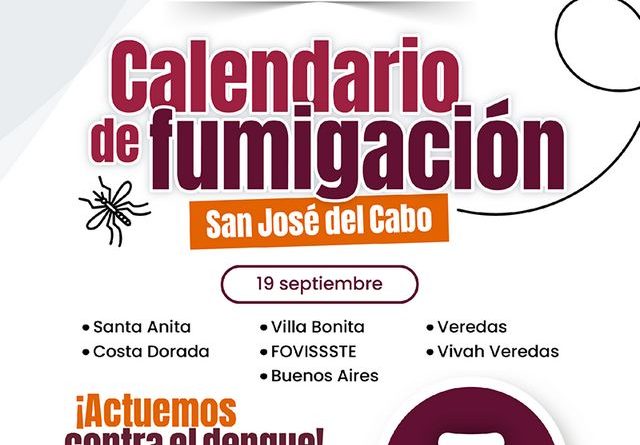 Como parte de las acciones que se llevan a cabo para fortalecer la prevención del dengue, que puede desarrollar formas graves e incluso derivar en desenlaces fatales, el Gobierno del Estado, a través de la Secretaría de Salud, iniciará este viernes 19, en el municipio de Los Cabos, el ciclo de fumigación contra el mosco transmisor de dicha enfermedad febril.