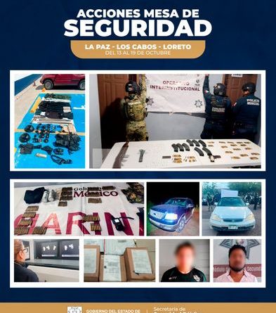 En el marco de las acciones coordinadas que realiza la Mesa Estatal de Seguridad para mantener el orden y la paz en Baja California Sur, informa los resultados obtenidos durante la semana del 13 al 19 de octubre en los municipios de La Paz, Los Cabos y Loreto.