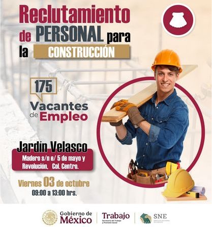 La Secretaría del Trabajo, Bienestar y Desarrollo Social (STByDS), a través del Servicio Nacional de Empleo de Baja California Sur (SNE-BCS), invita a personas con experiencia y conocimientos en el ramo de la construcción a participar en el reclutamiento que se llevará a cabo este viernes tres de octubre, en el Jardín Velasco, ubicado en la calle Francisco I. Madero entre Independencia y 5 de mayo, Colonia Centro, en horario de 9:00 a 13:00 horas.