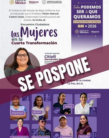 El Gobierno del Estado, a través del Instituto Sudcaliforniano de las Mujeres (ISMujeres), informa que el Encuentro Ciudadano “Mujeres en la Cuarta Transformación”, programado inicialmente para este sábado 7 de marzo, se realizará el próximo martes 17 de marzo a las 18:00 horas, en la explanada de la Plaza de la Reforma de Palacio de Gobierno.